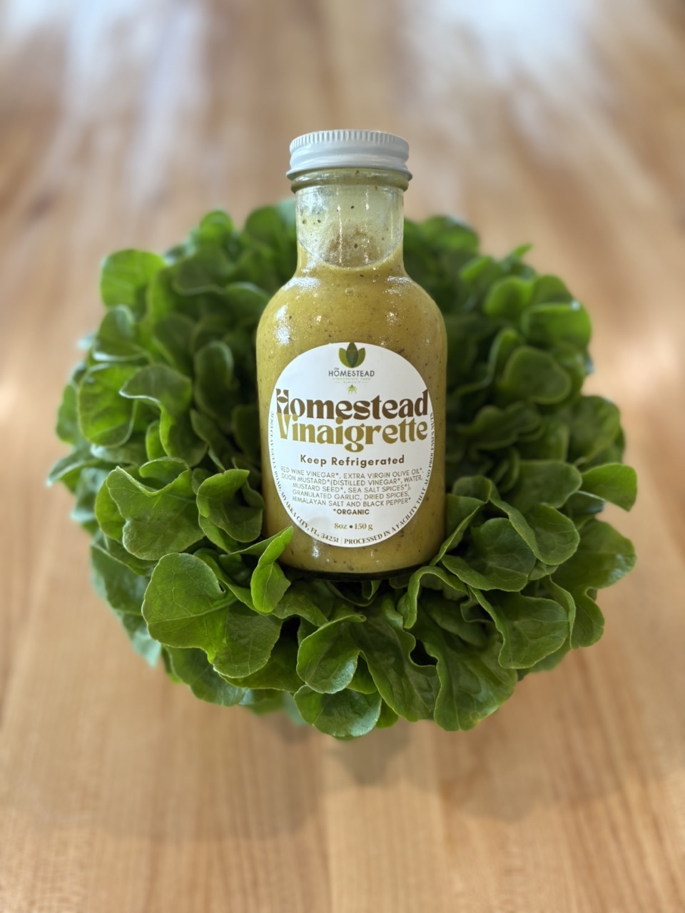 Our Homestead Vinaigrette is a small-batch dressing that bridges the best of two worlds — the zesty, herb-forward notes of Italian dressing and the smooth, tangy creaminess of French Dijon. Made right here at The Homestead Hydroponic Farm, it’s crafted with high-quality olive oil, organic vinegar, herbs, and a touch of sweetness for perfect balance.
